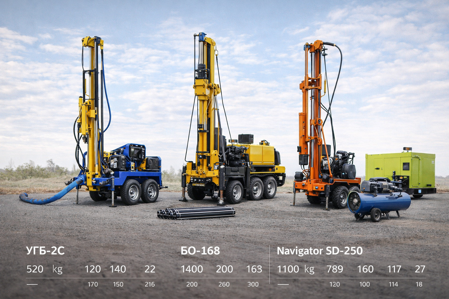 Популярные модели для бурения скважин 2026 года: УГБ-2С (520 кг), БО-168 (1400 кг), Navigator SD-250 (1100 кг). Мощность вращения шпинделя 30-55 кНм, ход 1,2-2 м.