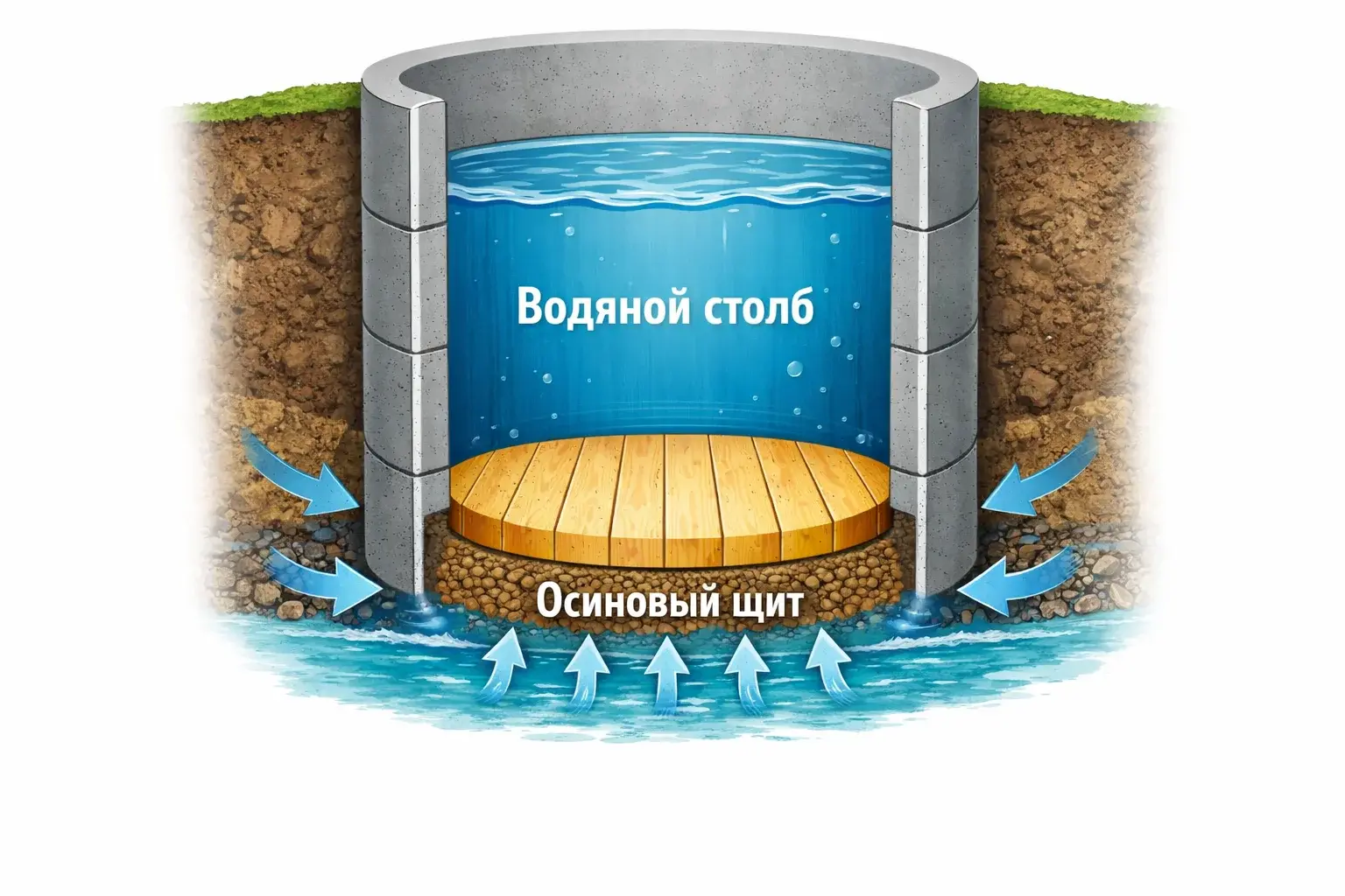 осиновый донный щит стабилизирует дно колодца, удерживает сложный грунт и сохраняет приток;