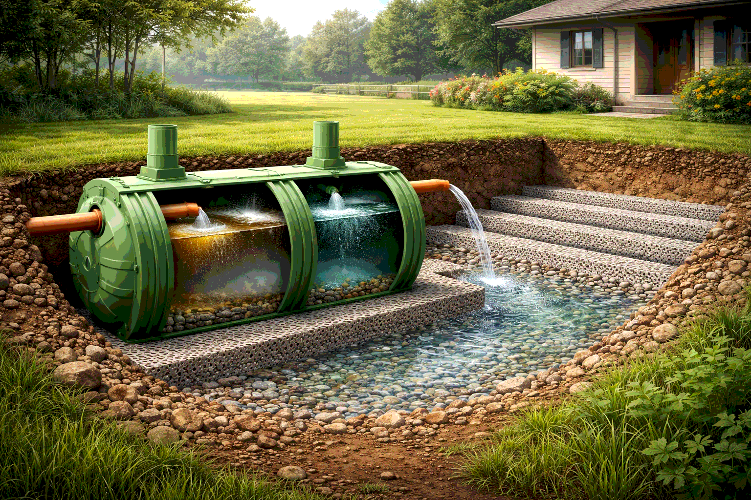 Если объяснять просто, дренажный септик — это не одна ёмкость, а система, где стоки проходят несколько этапов. Сначала септик принимает воду из дома и отделяет плотный осадок. Затем осветлённая часть переходит дальше и уходит в дренажный колодец, фильтрующую траншею или другое основание, которое помогает воде впитываться в почву. Поэтому дренажный септик нельзя путать с обычной выгребной ямой или полностью герметичной накопительной ёмкостью.
