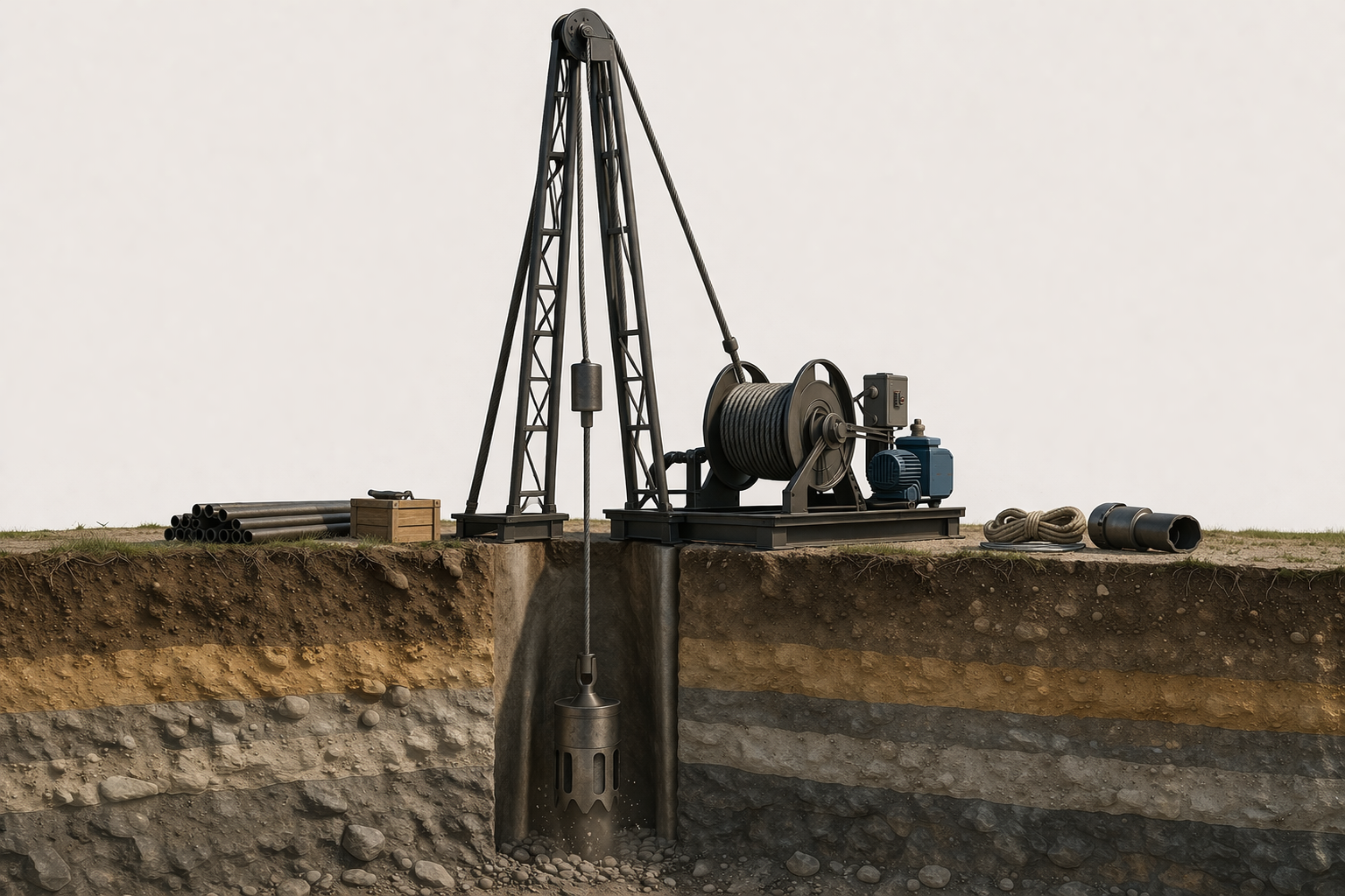 Метод канатного бурения скважин особенно ценится за простоту и универсальность. Он не требует сложной гидравлики или высокоточных механизмов, но при этом пробивает скважины глубиной до 300 метров и более.