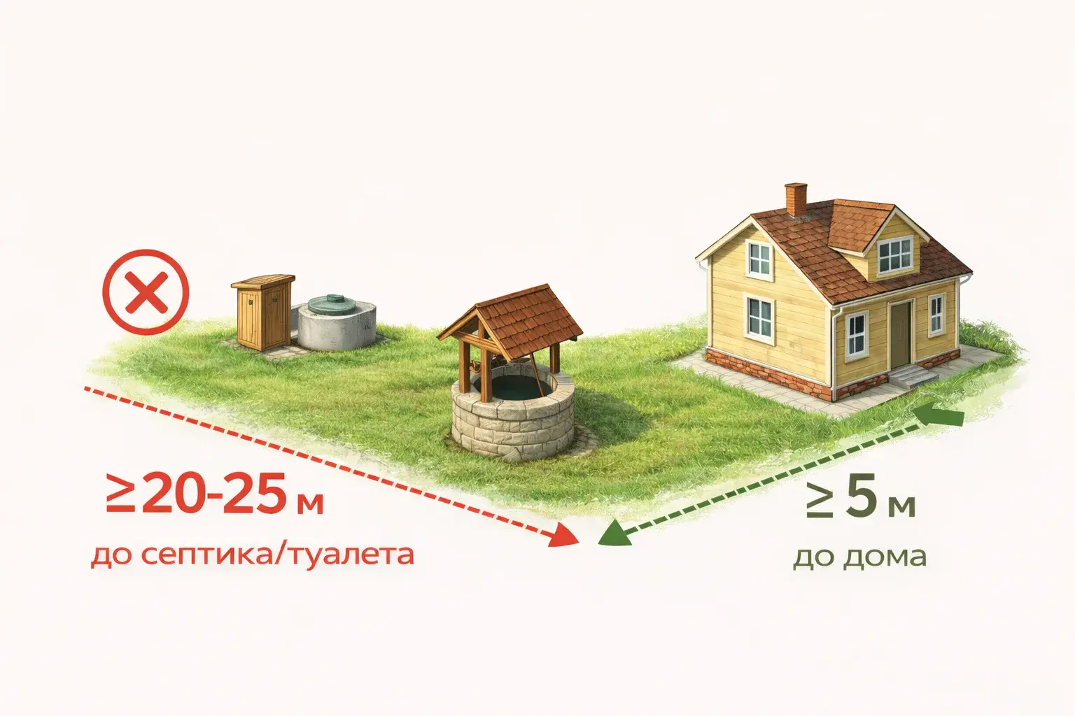 Колодцу можно быть только вдали от источников загрязнения: септик, туалет, выгреб, компост, слив бани. На песке и супеси колодцу можно только увеличенный запас по расстоянию: грунт «пропускает» загрязнение быстрее. На практике стараются держать 20–25 м и более до септика/туалета, а до дома — от 5 м (доступ, безопасность фундамента, обслуживание колодца).