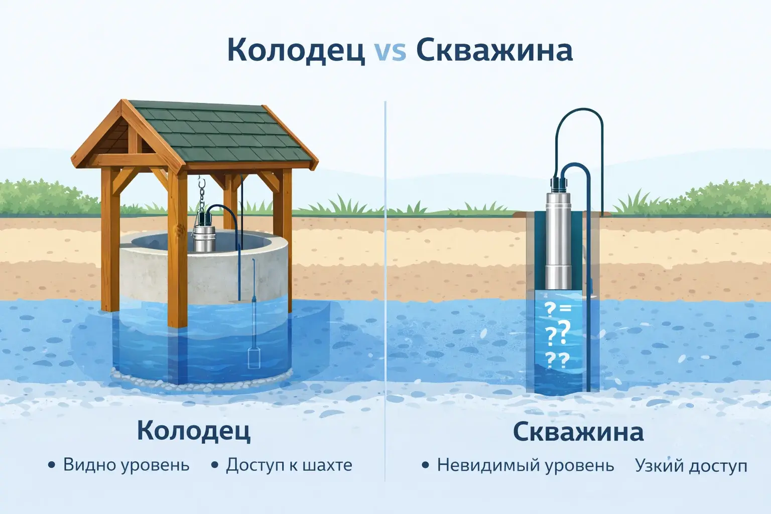 Скважина выигрывает по компактности и иногда по дебиту, но скважина «закрыта» от глаз: диагностика сложнее, а ремонт чаще дороже. Если нужен именно контролируемый источник рядом с домом, колодец часто оказывается спокойнее в эксплуатации.