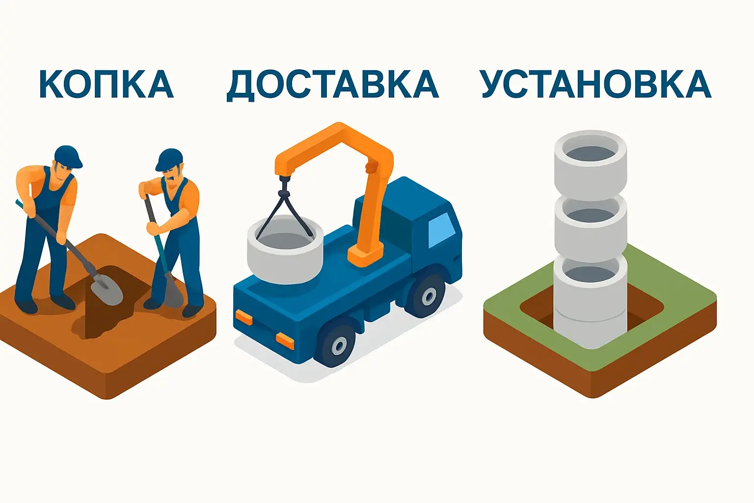 Компания «ВодаРядом» устанавливает септики из бетонных колец для дачи под ключ в Московской области. Мы производим ЖБИ-кольца на собственном заводе, что снижает цену септика для дачи на 15–20%. Копаем септики любой глубины вручную — без техники на участке.