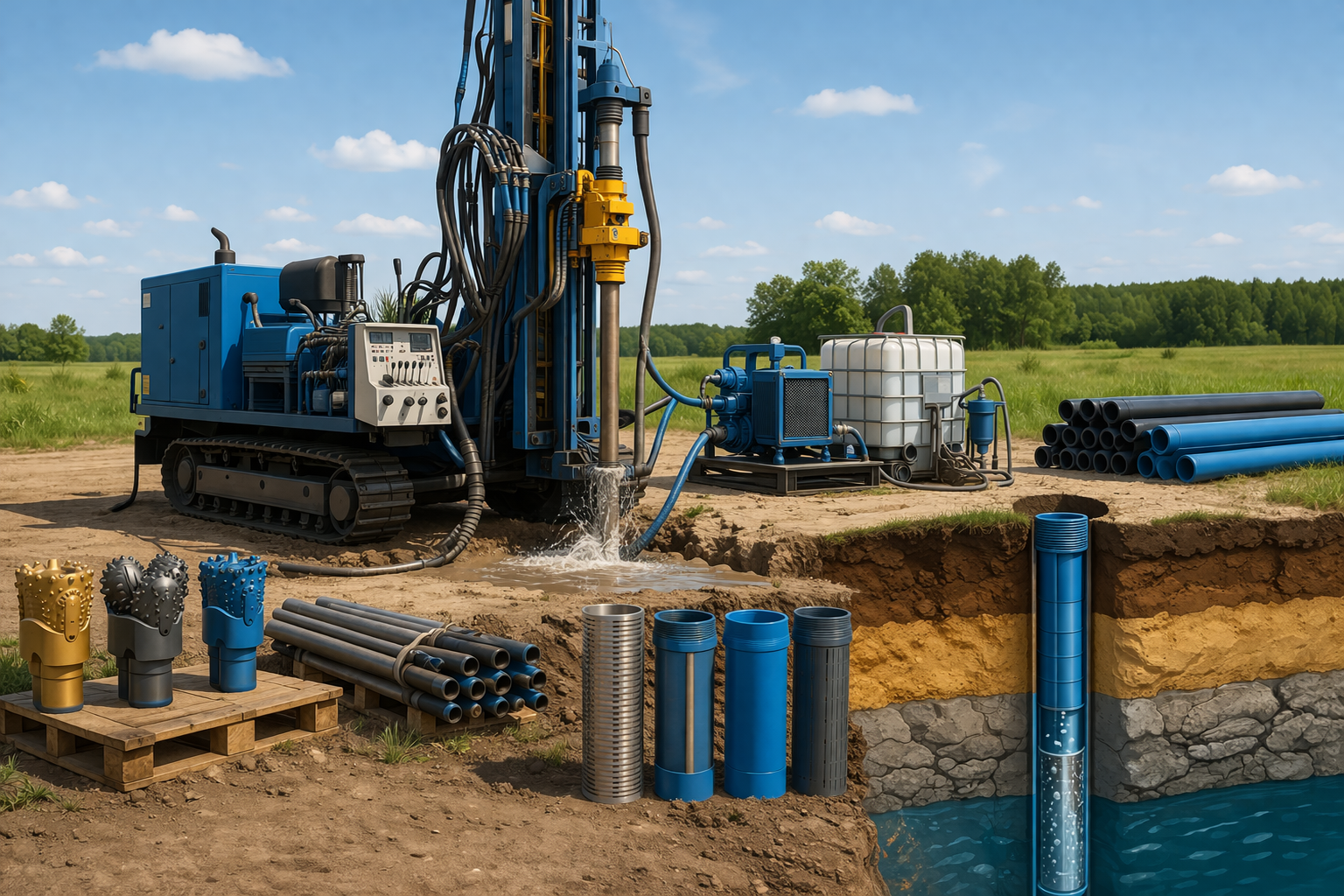Технология бурения скважин: роторное (250 м), ударно-канатное (120 м), гидро- и шнековое. Этапы: разведка → монтаж → бурение → обсадка → тестирование → паспорт. Оборудование: УРАЛ, PDC-долота, НПВХ трубы. Цена 2026: 2500–3500 руб/м. Совет: георазведка + СРО-подрядчик для дебита 2–4 м³/ч.